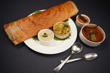 Crispy rice crepe filled with spiced potato, served with coconut chutney and hot sambar.